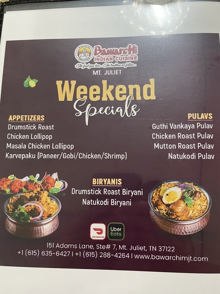 Welcome to Bawarchi Indian Cuisine, a gem nestled in the heart of Mt. Juliet, TN. This restaurant transcends culinary borders, offering a delightful array of Indian dishes that promise to tantalize your taste buds. From the moment you step in, the aroma of spices fills the air, inviting you to indulge in a rich tapestry of flavors.